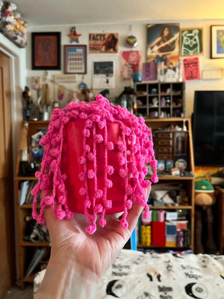 First, I picked out the perfect pink yarn and crocheted all the strings. Then I made a base a little bigger than the opening of my planter.